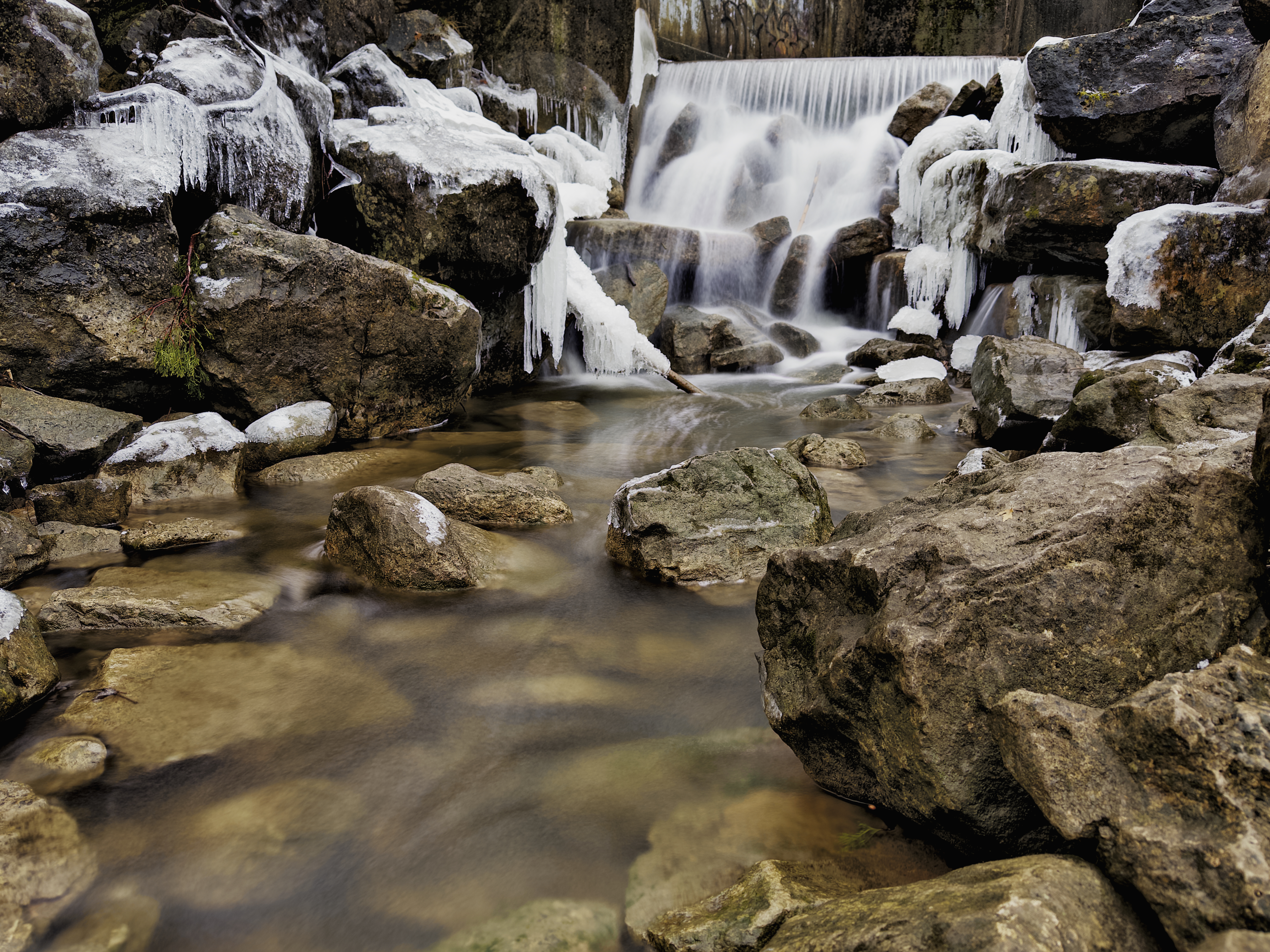 We had just picked up our dog from the groomer and thought it would be nice to let her stretch her legs and have a little bio break for some relief. There’s a place in my hometown called The Mill Dam where the water is always running through the dam itself, but also has a small runoff stream with its own little waterfall that leads back into the river below the dam. I honestly don’t know what the purpose of this runoff is, but I’ve taken photos of it many times during the various seasons.